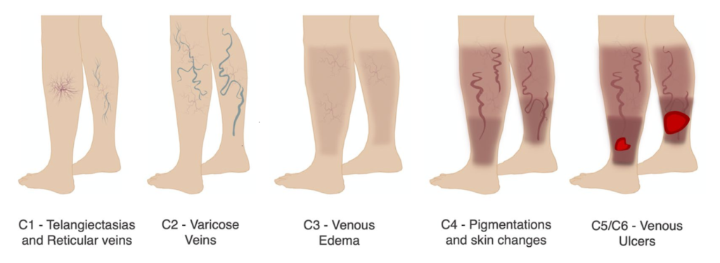 CEAP classification of chronic venous disease showing stages C1 telangiectasia, C2 varicose veins, C3 venous oedema, C4 skin pigmentation and changes, and C5/C6 venous ulcers.