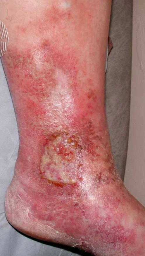 Persistent high pressure in the veins reduces oxygen and nutrient delivery to the skin. Even a minor scratch or bump can fail to heal properly. Over time, this can develop into an open wound (most commonly near the inner ankle).