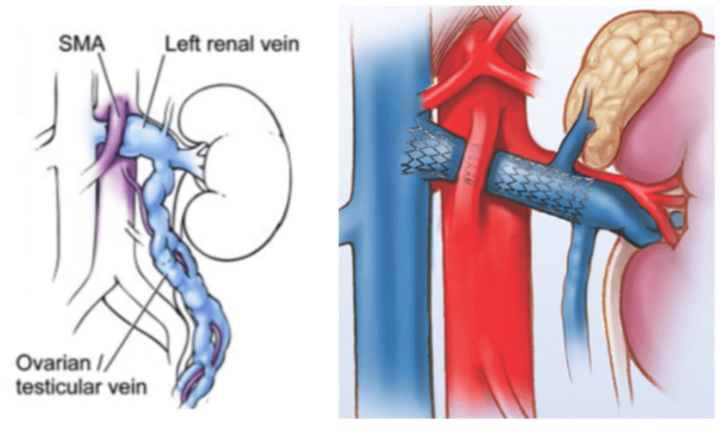 In some patients- especially those with symptoms on the left side (blood in urine, left flank pain)- Nutcracker syndrome may be the culprit. This is when the left renal vein is compressed, which in turn causes left ovarian vein reflux and varicose veins in the pelvis. For confirmed Nutcracker syndrome causing significant symptoms, renal vein stenting is a potential treatment option.
